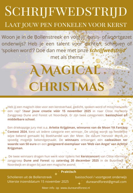 Laat jij de gasten van ons Kerstconcert op 20 december in een wereld vol winterse pracht binnenstappen tijdens het kerstconcert van Dune and Forest, het close harmony-koor dat Noordwijk al jaren verwarmt met sprankelende samenzang. Tijdens het Kerstconcert en bij de prijsuitreiking bij Boekhandel Van der Meer help jij kerst naar een hoger niveau te tillen – met een uniek programma waar woord en klank elkaar vinden in een betoverende setting.